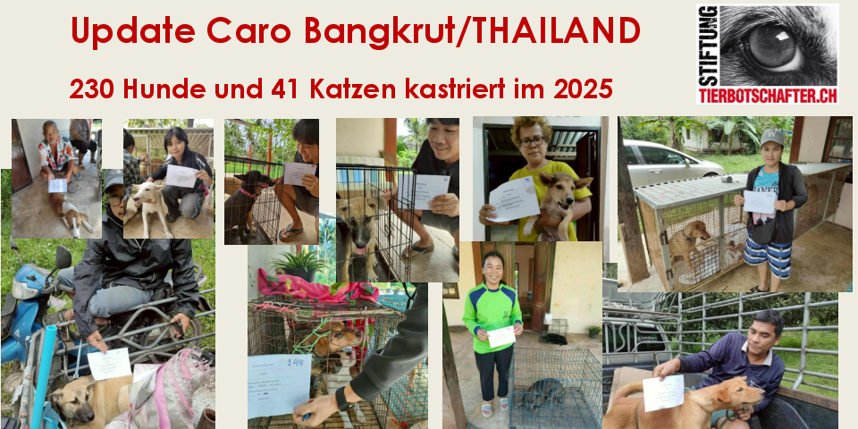 Caro ist sehr dankbar um unsere Unterstützung: „Mit jedem einzelnen Tier, das wir sterilisieren und kastrieren konnten, sind wir unserem Traum, unserem großen Ziel, ein kleines Stück nähergekommen. Von ganzem Herzen möchte ich mich bei Dir und den Tierbotschaftern bedanken für Eure grossartige Unterstützung für die Tiere in Bangkrut.